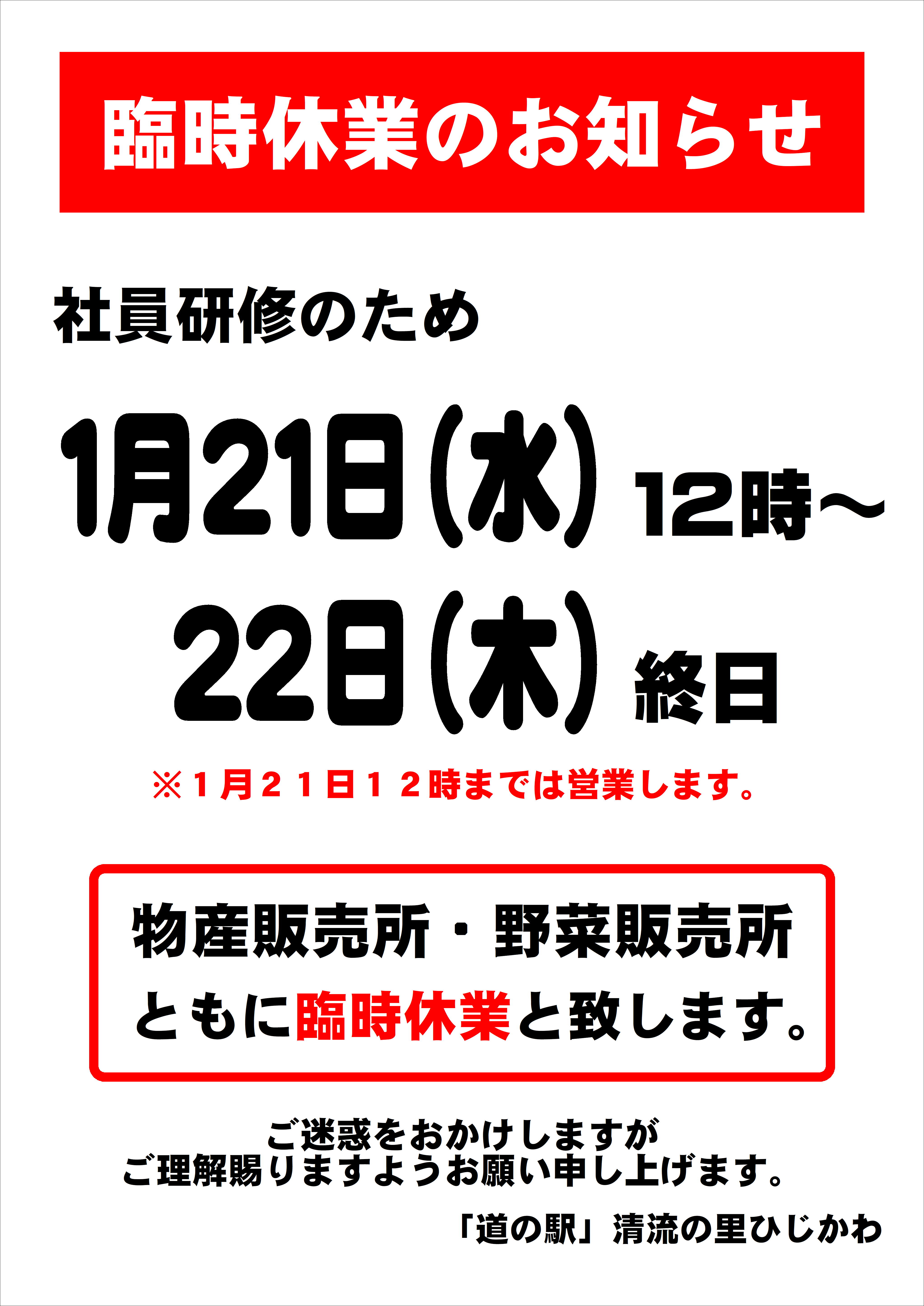 21日 22日 営業時間変更・臨時休業のお知らせ