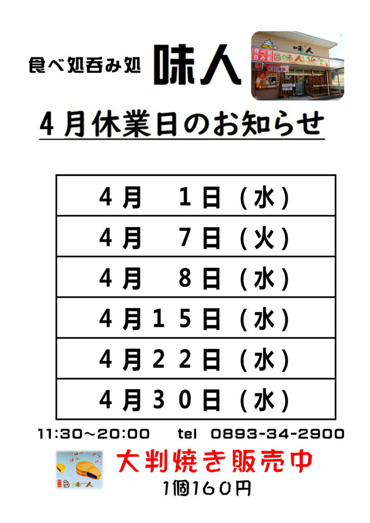 4月の 食べ処呑み処 味人 休業日のお知らせ
